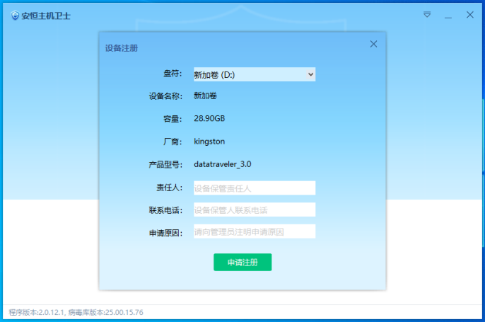 步骤2.插入移动存储设备(如图中的新加卷D:),提交注册申请;